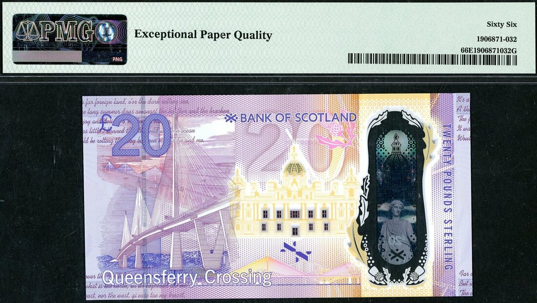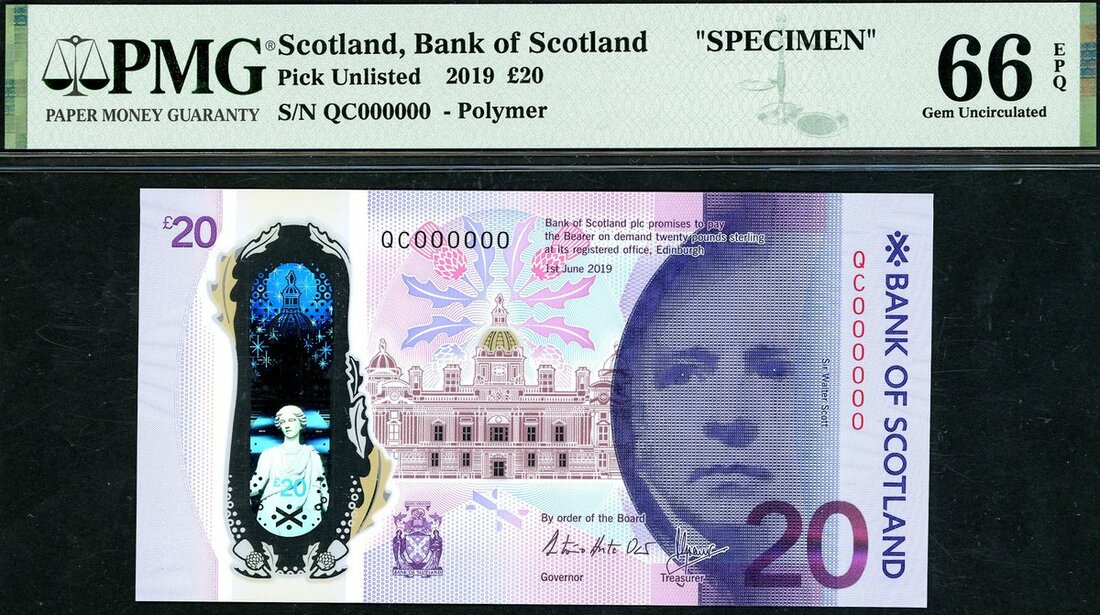 Bank of Scotland, specimen £20, 2019, purple, indigo and dark red, portrait of Sir Walter Scott at right, the Bank of Scotland’s head office (The Mound, Edinburgh) at centre, holographic foil stripe at left, featuring image of ‘Fame’, reverse, key features the Queensferry Crossing in the foreground, top left an aerial shots of all 3 bridges