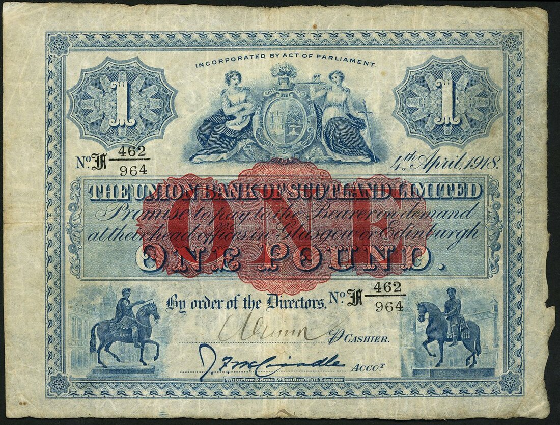 (x) Union Bank of Scotland Limited, £1, 4 April 1918, serial number F 462/964, printed signature McCrindle, handsigned cashier signature,