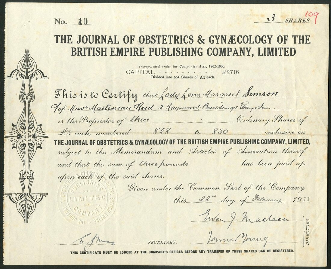 Great Britain: Journal of Obstetrics & Gynaecology of the British Empire Publishing Company Limited, £3 shares, 19[33], #10, black. An existing journal first published in 1902 making invaluable contributions to the subject. VF and first time seen by us.