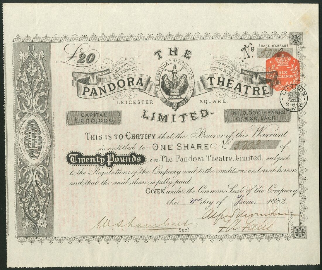 Great Britain: Pandora Theatre Ltd., Leicester Square, London, £20 share, 1882, #5003, vignette of 'Pandora emerging from her box', black, red duty stamp. Acquired the building occupied by the Royal London Panorama in Leicester Square, and set about converting it into a theatre. The Pandora Theatre Company failed in 1883 without completing building work and it was completed by the Empire Theatre Company which opened in the following year. EF.