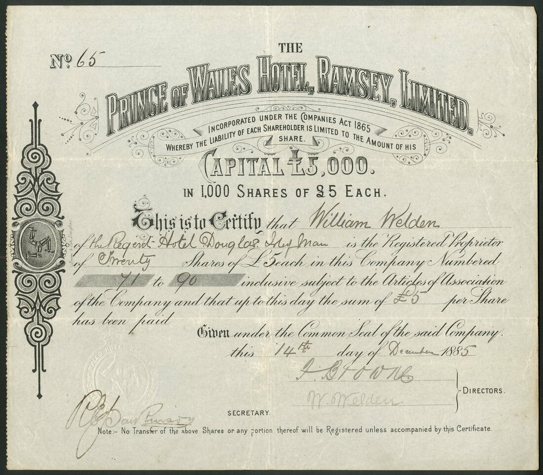 Great Britain: Prince of Wales Hotel, Ramsay, Limited, £5 shares, 188[5], #65, scrollwork at left with trisceles, black. Hotel on the seafront at Ramsey, Isle of Man. Apparently sold to Wilsons Brewery Limited in 1897. VF and rare.