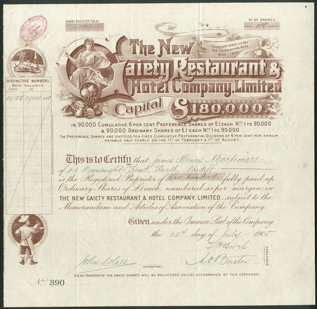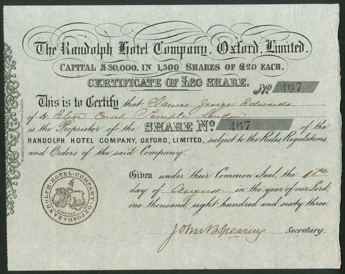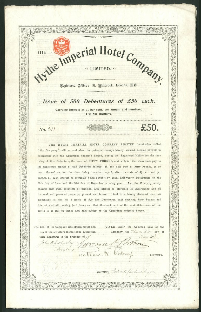 Great Britain: A trio of Hotel companies, comprising Randolph Hotel Company, Oxford, Limited, £20 share, 1863, #467, black; New Gaiety Restaurant & Hotel Company Limited, £1 ordinary shares, 190[5], attractive piece, brown, and, Hythe Imperial Hotel Company Ltd., £50 debenture, 190[3], #211, black, large format. All VF to EF (3).