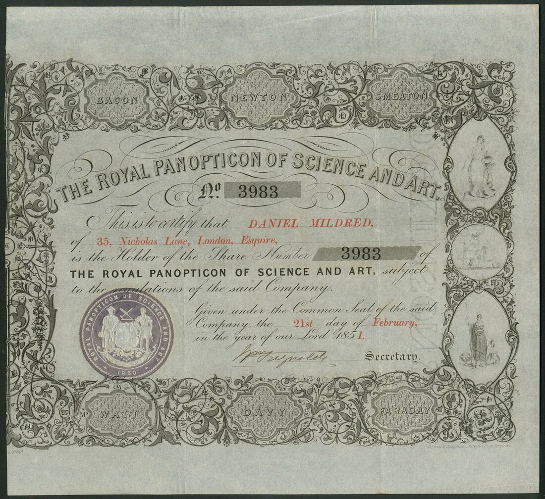 Great Britain: Royal Panopticon of Science and Art, certificate for one share, 185[1], #3983, issued to Daniel Mildred, partner in the private Bank of Mastermans in London, very ornate border with small vignettes of allegorical figures, names of famous scientists in medallions such as Newton, Watt, Faraday and Davy, black, mauve embossed seal. A large and impressive structure in Moorish style, erected in Leicester Square, to hold scientific exhibitions. The building opened in 1854 just before the outbreak of the Crimean War and the company failed within 2 years. Sold and turned into the Alhambra. The Odeaon cinema now stands on the site. GVF and now scarce.