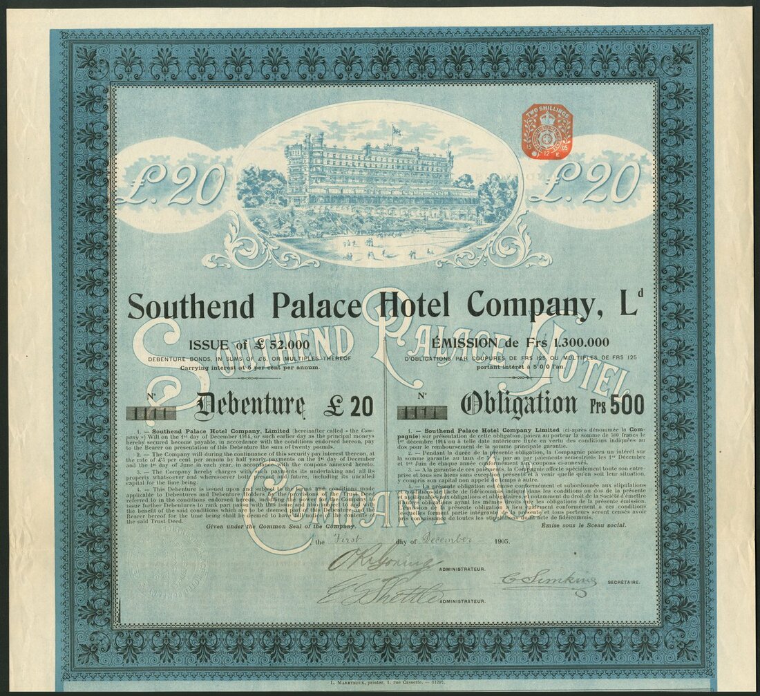 Great Britain: Southend Palace Hotel Co. Ltd., £20/500 franc bond, 1905, #1111, large vignette of the hotel, ornate border, blue and black, text in English and French, with coupons. Built in 1904 on Pier Hill, on Southend's seafront. Had a total of 220 bedrooms, a skating rink, billiard room and a large ballroom. Converted to a hospital during WWI. Recently acquired by the University of Essex. GVF.