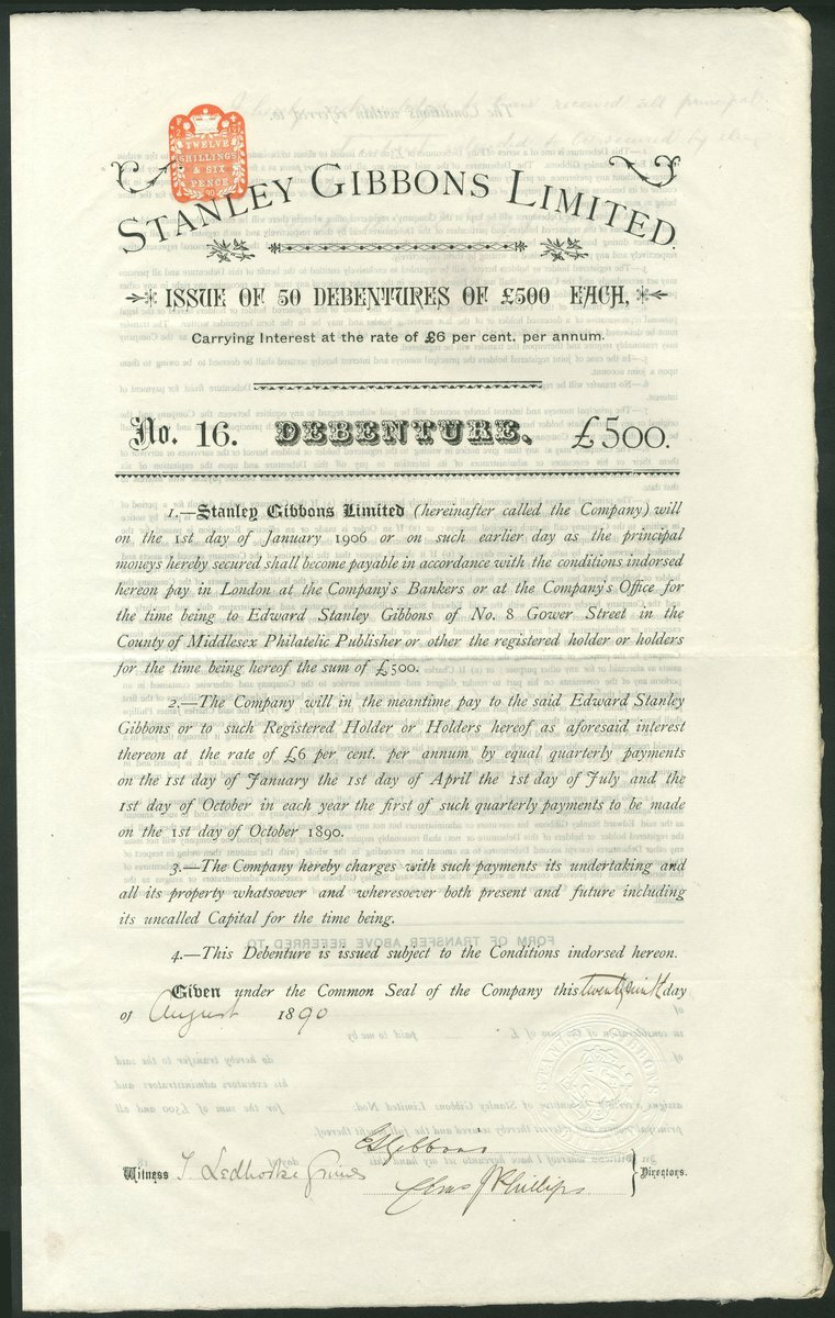Great Britain: Stanley Gibbons Limited, 6% debenture for £500, 18[90], #16 (of only 50 issued), signed by Edward Stanley Gibbons and Charles J. Phillips as directors, large format, black, 4 pages. The name is synonymous with Stamp collecting. Investor Charles Phillips joined Stanley Gibbons in the first limited company venture which was subsequently wound up following the death of Gibbons in 1913. GVF and scarce.