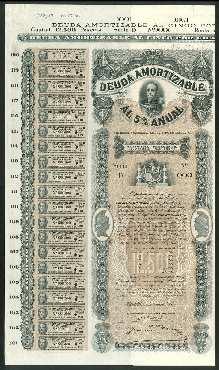 Spain: Government 5% Internal Loan 1920, a specimen bond for 12,500 pesetas, from the Bradbury, Wilkinson & Co. archive, series D, Madrid 1920, large format piece with ornate borders, black, pinkish-brown underprint, vignette of King Alfonso XIII in military uniform at top, coupons either side, small hole cancels. GVF and rare.