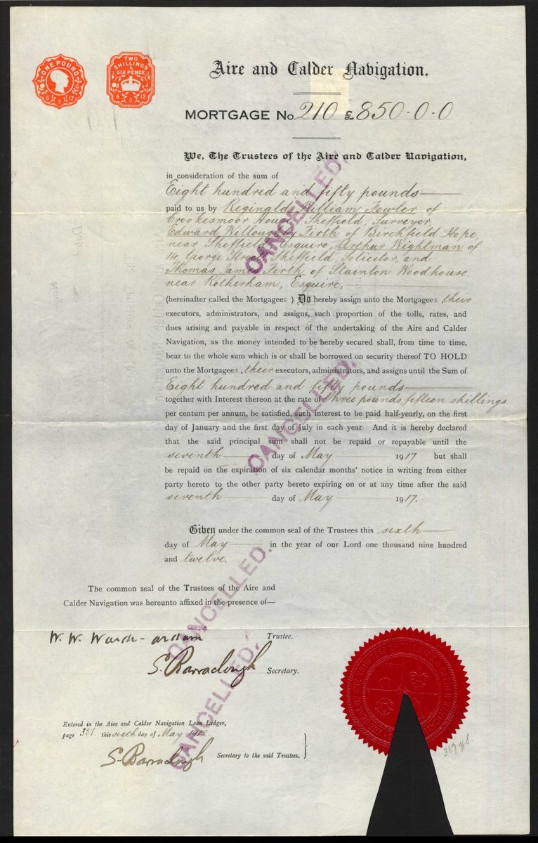 Great Britain: Aire and Calder Navigation, a mortgage bond for £[850], 19[17], #210, large format piece, black, waxed paper, red paper seal. Stamped CANCELLED and triangular cut cancellation at bottom, VF. NO RESERVE