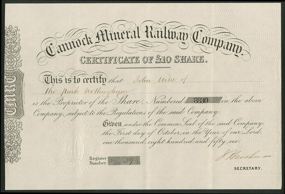Great Britain: Cannock Mineral Railway Company, £10 share, 1856, #8830, black, printed by Waterlow & Sons, embossed seal. Originally authorised in 1847 as the Derbyshire, Staffordshire and Worcester Junction Railway but the project was reduced and renamed as this in 1855. Built by Thomas Brassey. Taken over by the London & North Western Railway. Better than GVF and scarce.