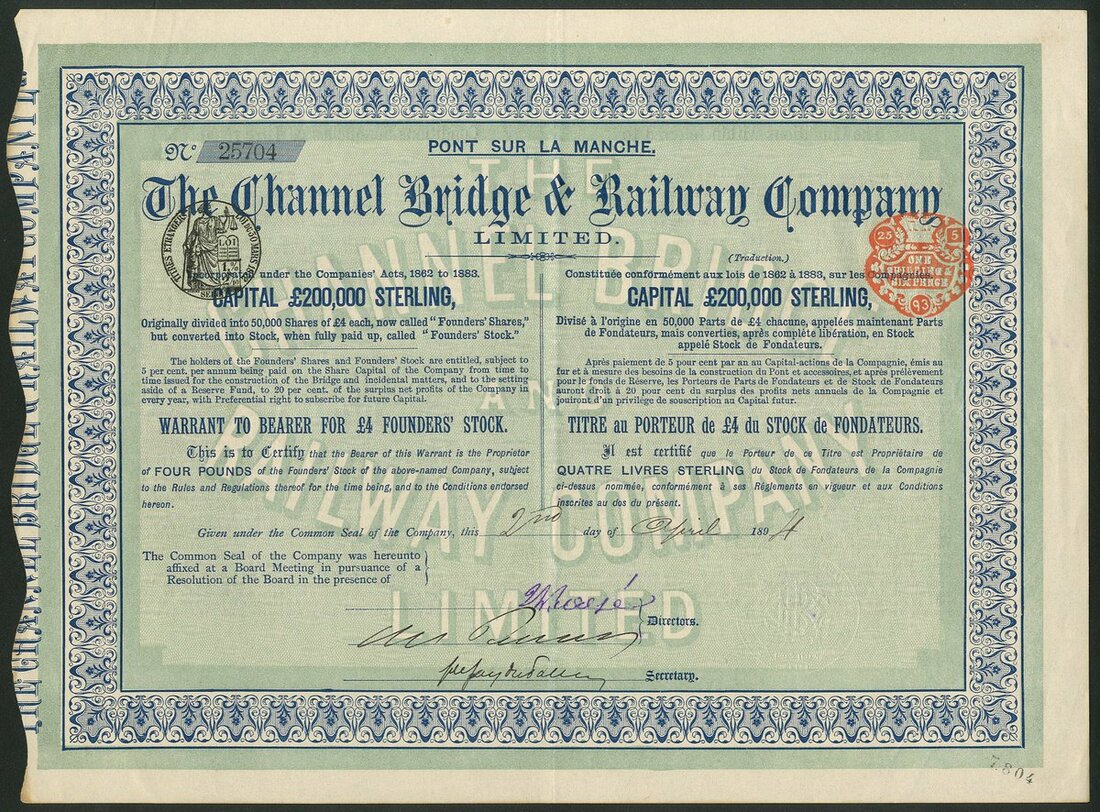 Great Britain/France: Channel Bridge & Railway Company Limited, £4 founders stock, 189[4], #25704, blue, text in English and French. Formed to build a bridge across the Channel between England and France using over 1,000,000 tons of steel. Not surprisingly the plain did not go ahead but instead the company was granted permission to build large ferry boats which could carry railway carriages. The concession was passed to the Intercontinental Railway Co. Ltd. in 1902. EF and scarce.