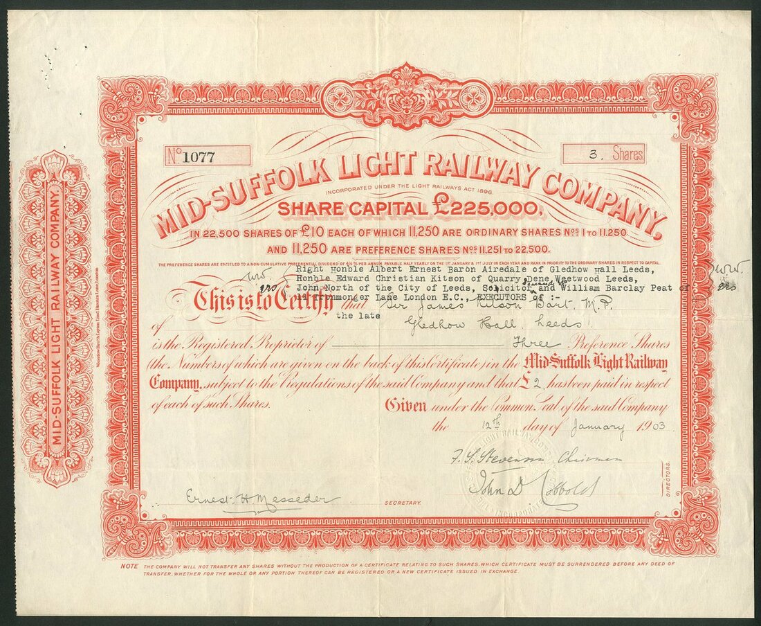 Great Britain: Mid-Suffolk Light Railway Co. £10 Preference shares, 19[03], #1077, scrollwork at left and top, printed by Waterlow Bros & Layton, decorative border, red.  A 19 mile line between Haughley Junction and Laxfield. One of the last railways to be constructed in England, open to passengers in 1908, taken over by L.N.E.R. in 1924. GVF and scarce.
