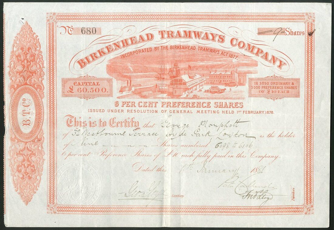Great Britain: Birkenhead Tramways Company, 6% preference shares of £10, 18[81], #680, lovely vignette of the Woodside Ferry terminus with horse drawn tram waiting to depart, several ships at the dockside, red. Originally formed as Birkenhead Street Railway Co. Ltd. in 1860, the first tram line in the country. Under Act of 1877 acquired by this new company. In financial difficulty by 1889 and liquidated. By 1901 part of Birkenhead Corporation Transport. VF and scarce.