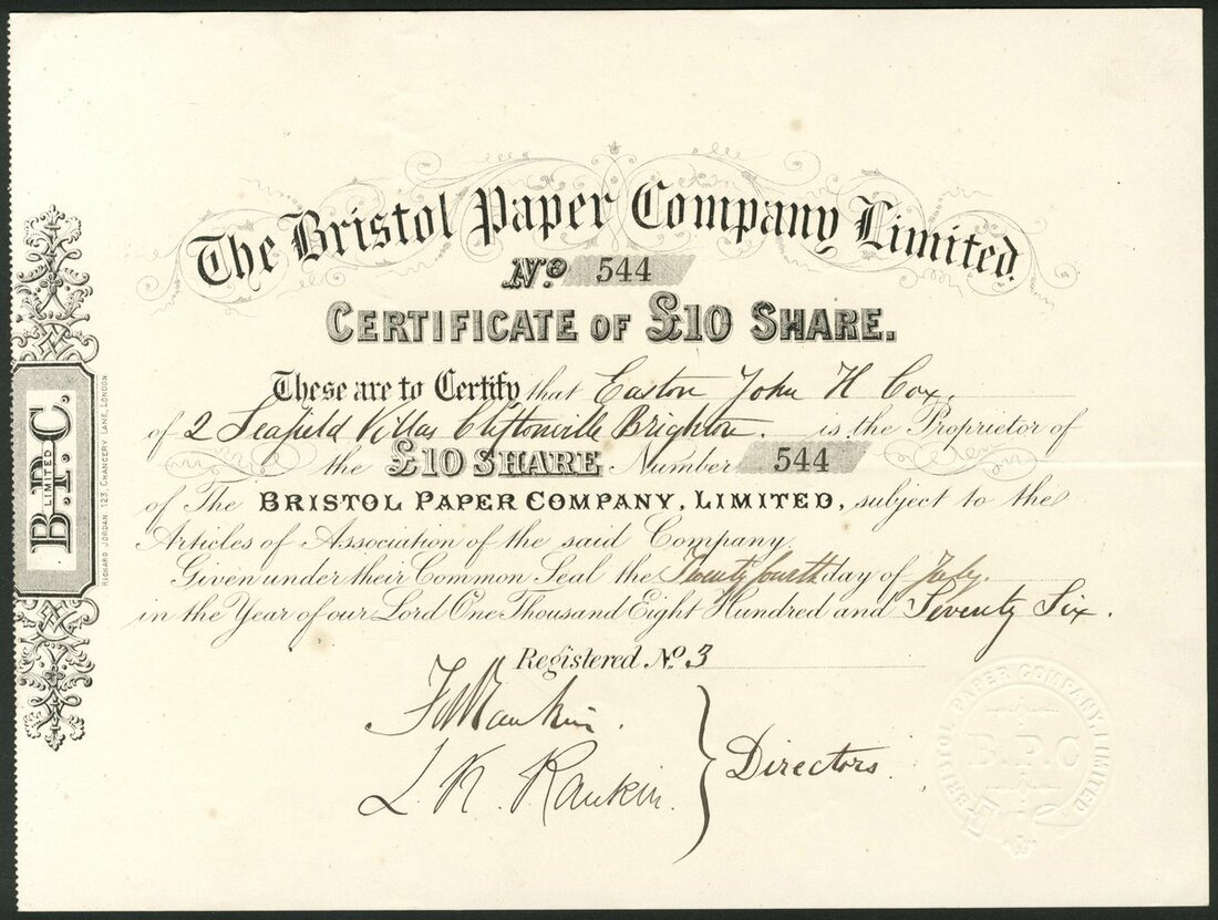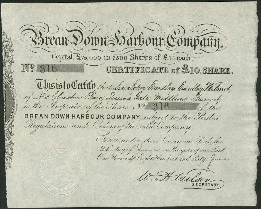 Great Britain: Brean Down Harbour Company, £10 share, 186(5), #316, issued to Sir John Eardley Wilmot, black. Proposed harbour near Burnham on Sea, Somerset. The foundation stone was laid in November 1864 by Lady Wilmot but sadly was washed away by an overnight storm. Beset by problems and the death of the contractor, the scheme was abandoned in 1868. Together with other local companies, Bristol Paper Company, £10 share.18[76], black, and Bristol Brewery George & Company Ltd., 4% debenture stock certificate, 19[55], black on orange paper. VF-EF (3). NO RESERVE