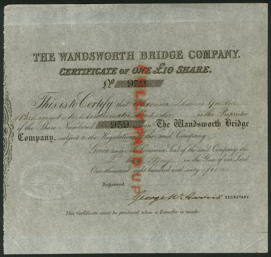 Great Britain: Wandsworth Bridge Company, £10 share, 186[5], #959, black on thin paper, red 'FULLY PAID UP' on face. The first bridge was completed in 1873 and was of 5 span lattice-girder construction, as illustrated on the company seal. Built by J.H. Tolme, this bridge across the Thames was taken over by the Metropolitan Board of Works and made free of tolls, like many other London bridges, in 1880. It was replaced in 1940 by the present structure. AEF. NO RESERVE