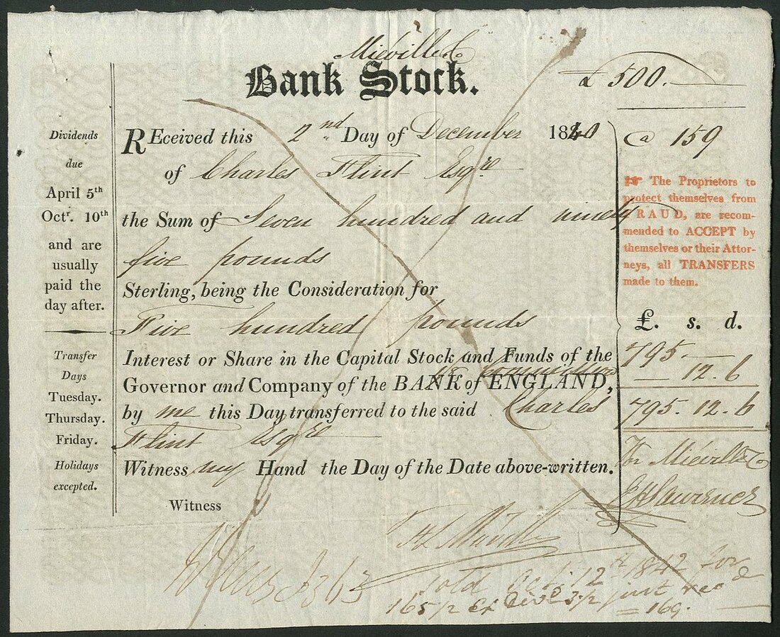 Great Britain: Bank of England, inscribed stock receipt for the sale of £[500] capital stock for the sum of £[795], 183[40], red and black printing. No corner damage from spiking, VF and scarce thus.
