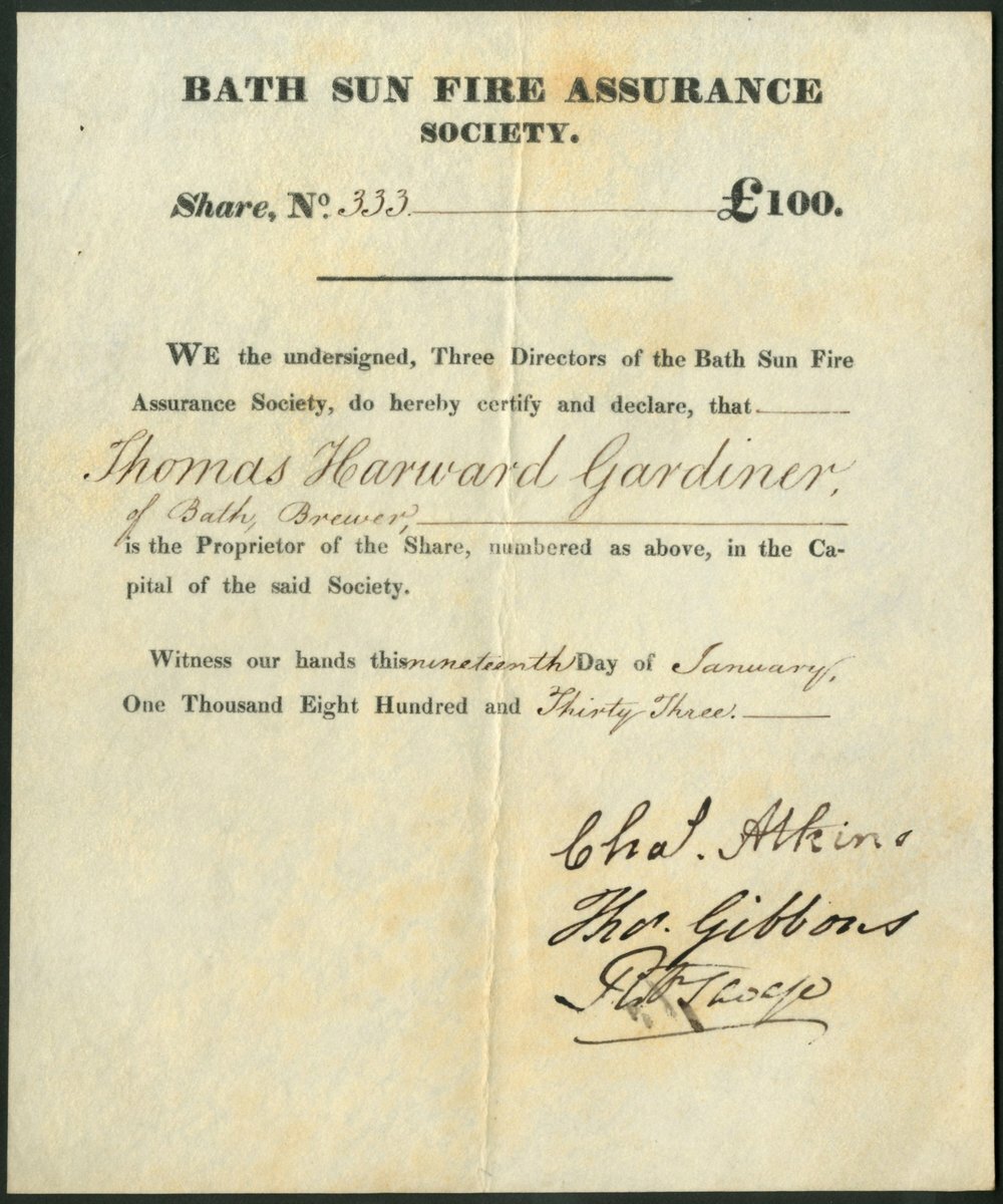 Great Britain: Bath Sun Fire Assurance Society, £100 share, 18[33], #333, black printing, on vellum. Formed in 1776 and acquired by the Sun Fire Office in 1838. A little toned but GVF and scarce [R9].