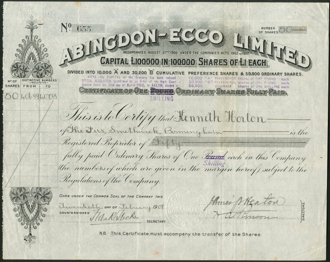 Great Britain: Abingdon-Ecco Ltd., £1 ordinary shares, overprinted 1 shilling, 19[08], black. Registered to amalgamate two companies in the armament & cycle industry and extended their activities to motor cycles and a range of motor cars from 1902. Situated at Tyseley, Birmingham, the company changed its name to Abingdon Works Ltd. In 1919. Motor cycles were produced until 1925 and motor cars until 1923. VF.