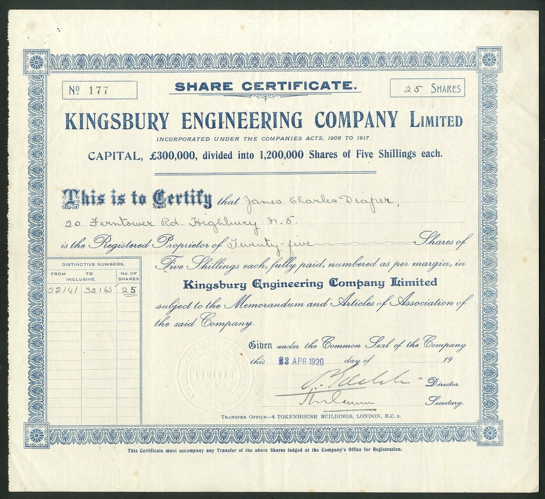 Great Britain: Kingsbury Engineering Company Limited, 5 shilling shares, 19[20], #177, ornate border, blue. Took over some workshops near Harrow in 1919 to build a 2 cyclinder light car called the Kingsbury Junior. Liquidated in 1921. VF.