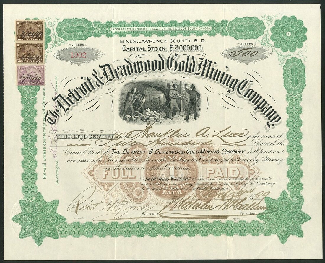 U.S.A.: Detroit and Deadwood Gold Mining Company, $1 shares, Detroit 18[99], #1902, miners in shaft below title, ornate border, green and black, brown underprint. Owned the McCallum mine at Annie Creek, Deadwood, South Dakota. Formerly Deadwood Gold Mining Company. Sold at Sherrif's sale October 1904. GVF.