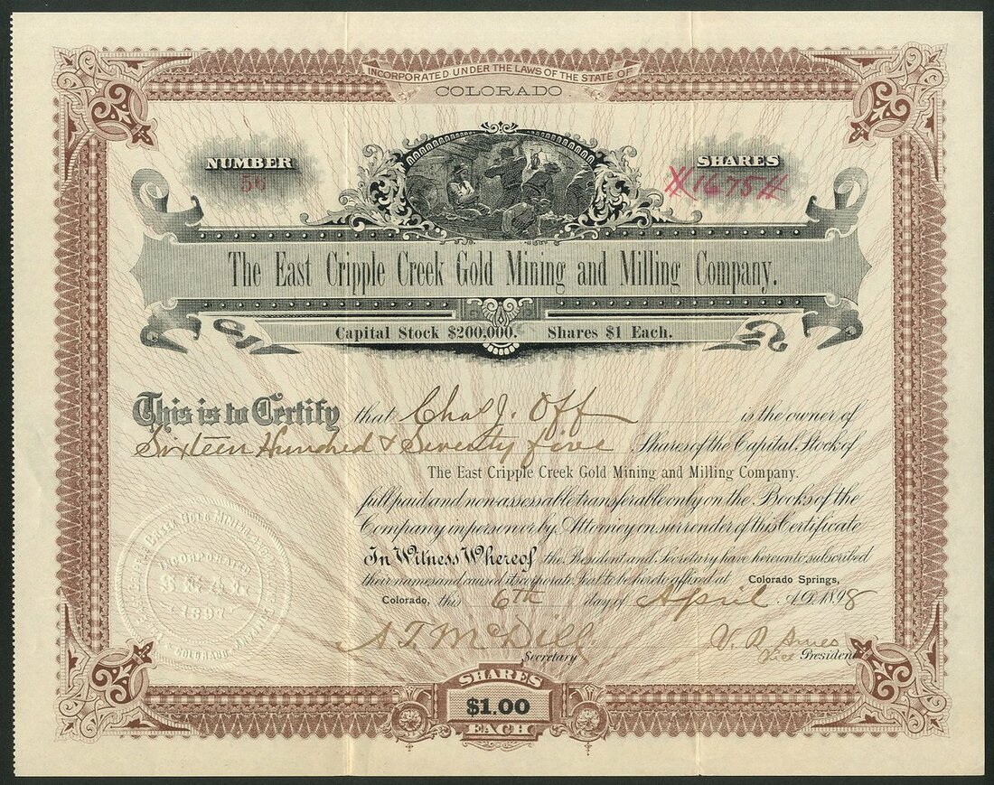 U.S.A.: East Cripple Creek Gold Mining and Milling Company, $1 shares, Colorado Springs 189[6], #56, miners above title, ornate border, brown and black. Folds have been repaired on top edge, F-VF.