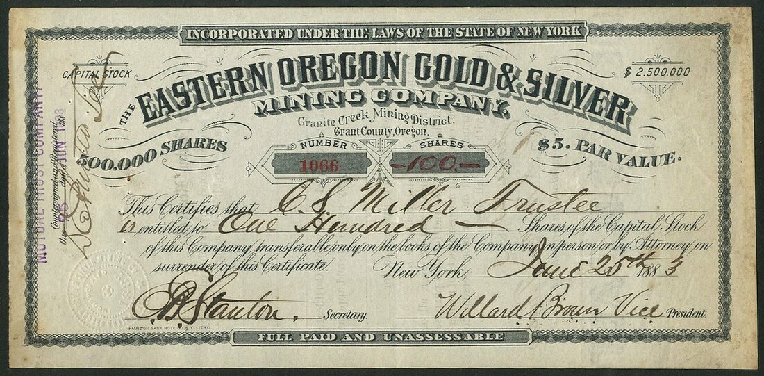 U.S.A.: Eastern Oregon Gold & Silver Mining Company (OR), $5 shares, New York 188[3], #1066, decorative black printing. Mines at Granite Creek Mining District, Grant County, Oregon. Slightly discoloured at edges, VF.