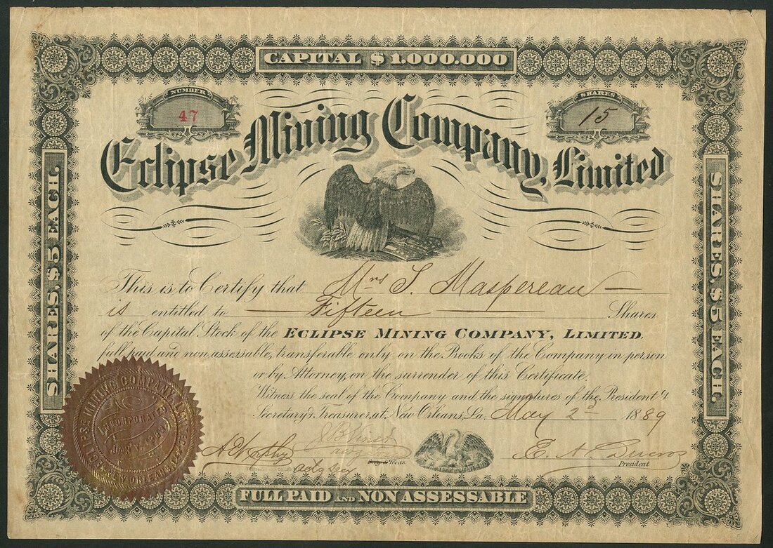 U.S.A.: Eclipse Mining Company Ltd., $5 shares, New Orleans 18[89], #47, eagle below title, decorative black printing, gold paper seal. Incorporated in Louisiana in January 1889 with offices in New Orleans. Owned the Martha Lode claim, the Brighton No.2 Claim and the Virginian Lode, all in the Idaho Mining District, Clear Creek County, Colorado. Liquidated by auction in 1892. Small edge nicks and very slight discolouration, VF.