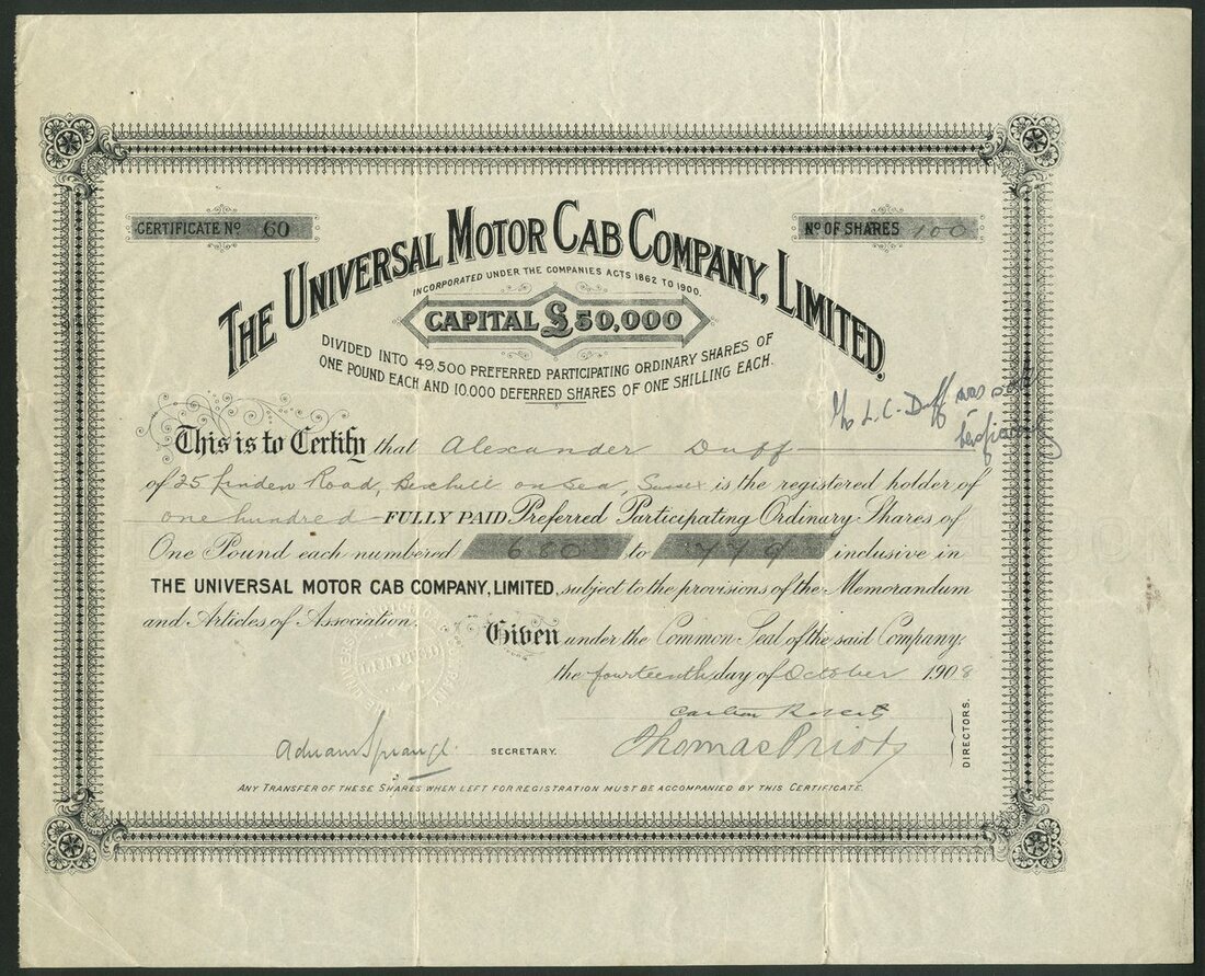 Great Britain: Universal Motor Cab Company Limited, £1 preferred shares, 190[8], #60, ornate border, black. Formed in 1908 to operate motor cabs in London. They entered into a contract with Humber for the supply of 100 x 14hp motor cabs and were in direct competition with the General Motor Cab Company which had already increased it fleet by the end of 1907 to 467 vehicles. VF and rare.