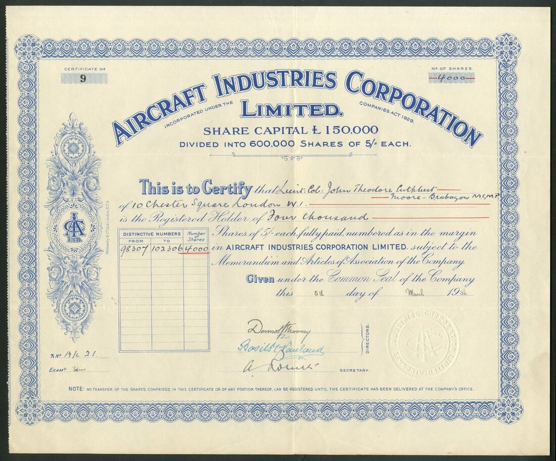 Great Britain: Aircraft Industries Corporation Limited, 5/- shares, 19[36], #9, ornate border, blue. Formed for the financing of specialist aviation companies and had amongst its directors Lieutenant Colonel Moore Brabazon, president of the Royal Aeronautical Society, and this piece is issued to him. They were invlved with the acquisition by British Marine Aircraft Ltd. of the license to build the Sikorsky S.42 Flying Boat. John Theodore Cuthbert Moore-Brabazon, 1st Baron Brabazon of Tara, 1884-1964, aviation pioneer, the first Englishman to piolot a heavier-than-aur flying machine in England, minister of Transport and Minsiter of Aircraft production during WWII. He was the first person to qualify as a pilot and received the Royal Aero Club aviator's certificate #1. VF and rare. First time seen by us.