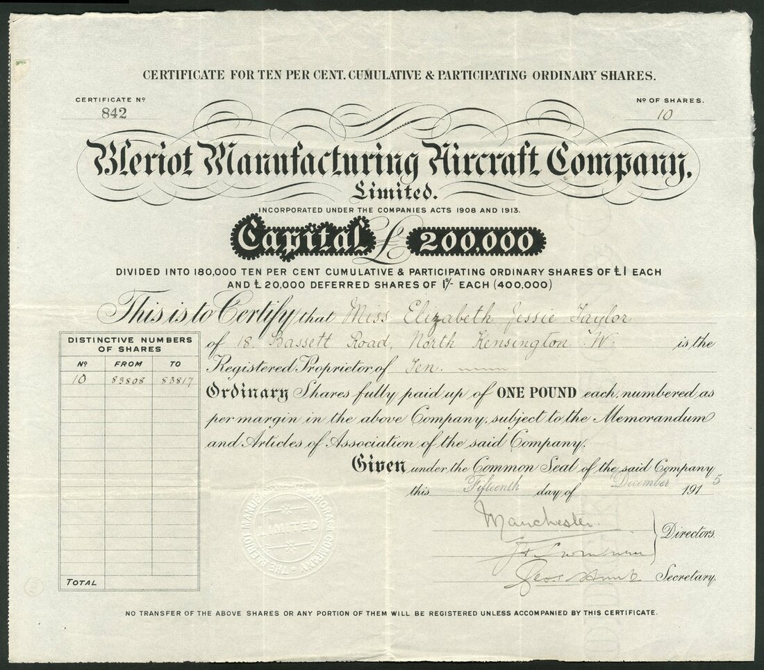 Great Britain: Bleriot Manufacturing Aircraft Co. Ltd., £1 ordinary shares, 191[5], #842, signed by the 9th Duke of Manchester as director, black. Louis Bleriot set up this London subsidiary in 1915 so that he could offer aircraft to the British Government. His designs however were becoming outdated and there were no orders from the Government. Following an fight for control of the company between Bleriot and Harry Lawson the company was would up in 1916. VF and rare. First time seen by us.
