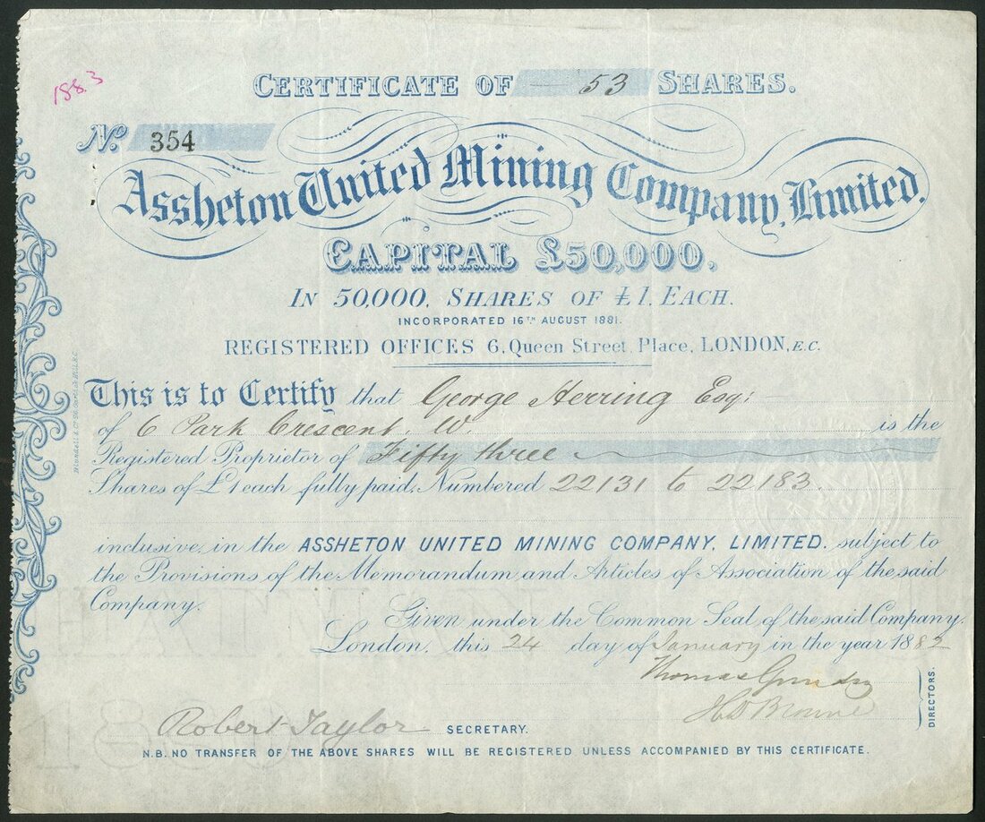 Great Britain: Assheton United Mining Company Limited, £1 shares, 18[82], #354, blue. Mines at Abersoch, Caernarvonshire. VF and scarce. One of two found in 2019.