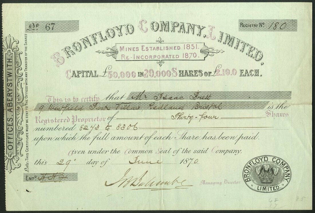 Great Britain: Bronfloyd Company Limited, £2 10s shares, 187[0], #67, mauve and black printing on green paper, seal depicts Prince of Wales' feathers. Silver Lead mines near Aberystwyth. VF and rare.