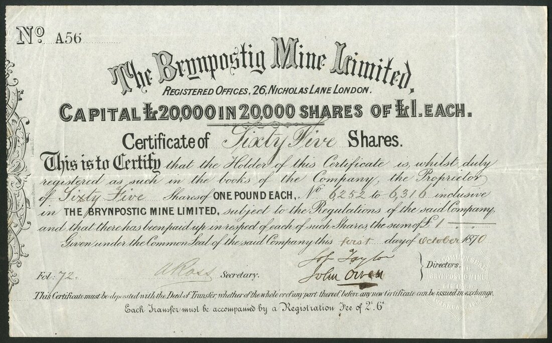 Great Britain: Brynpostig Mine Limited, £1 shares, 187[0], #A56, black. Silver-Lead mine at Llanidloes, Montgomeryshire.