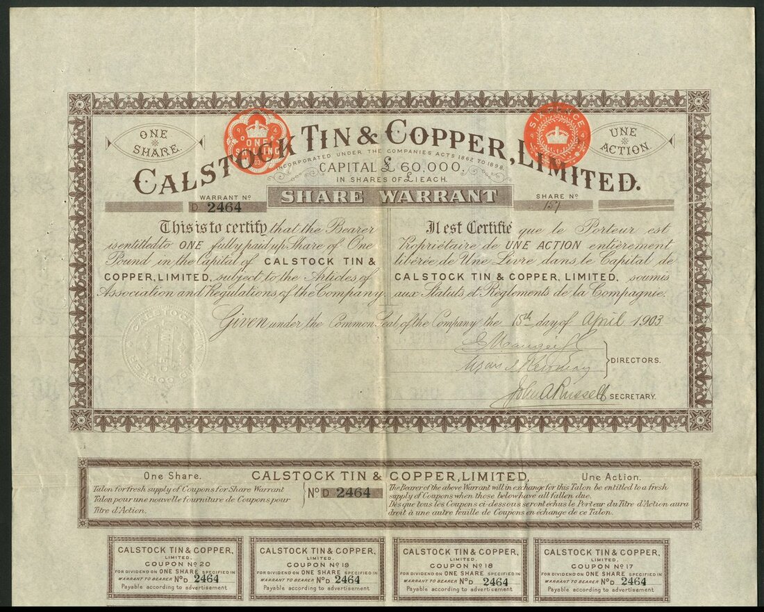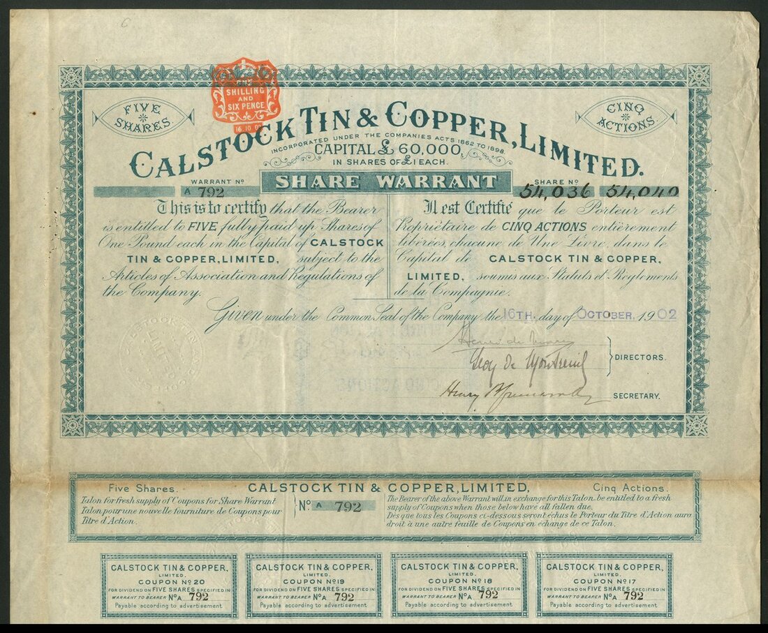 Great Britain: Calstock Tin & Copper Limited, pair of certificates for 1 share, 19[03], #D2464, brown and 5 shares, 19[02], #A792, green, both woth ornate border and coupons. VF (2).
