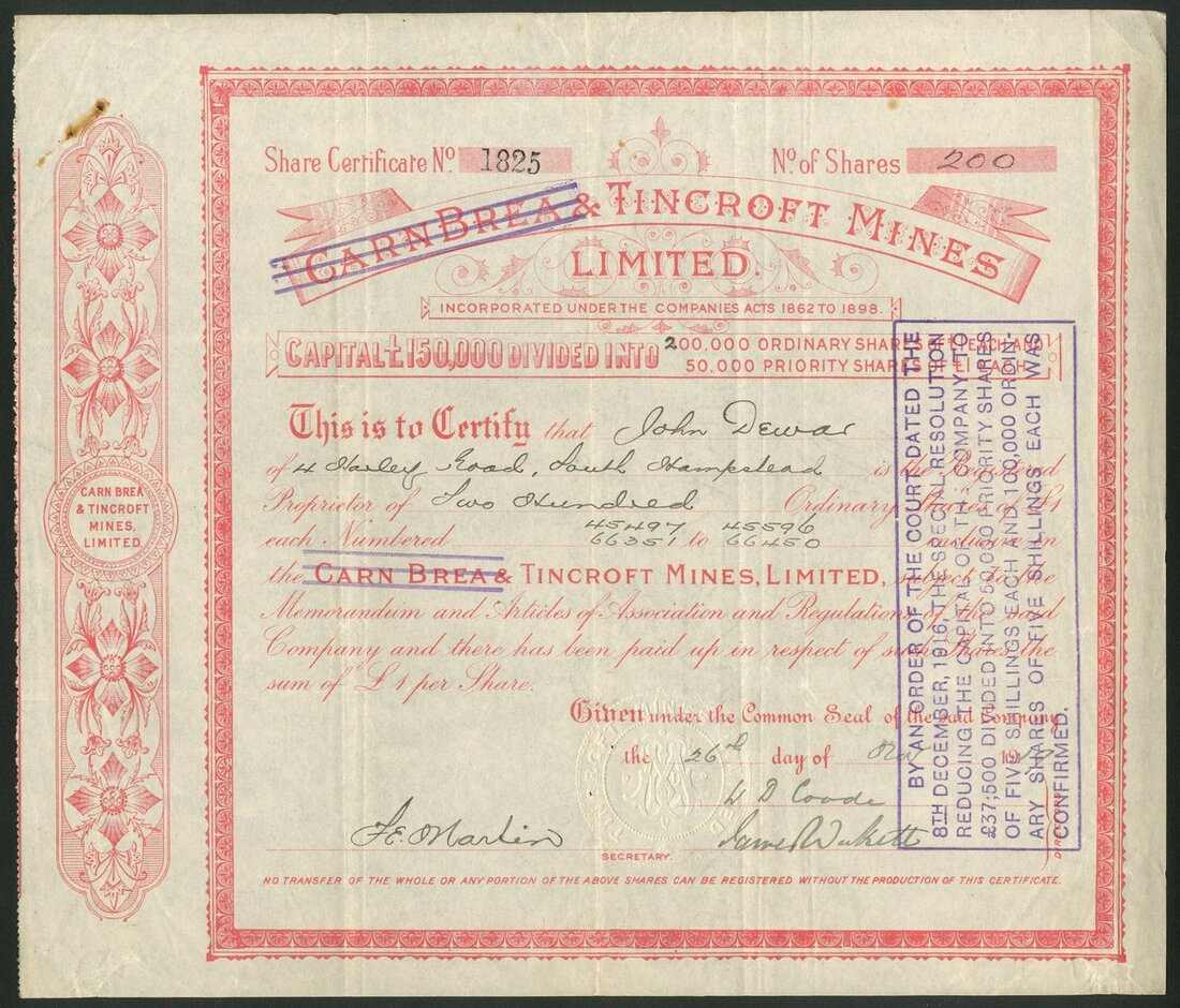 Great Britain: Carn Brea & Tincroft Mines Limited, £1 shares, 19[19], #1825, scrollwork at left, red, title changed to just Tincroft Mines Ltd. A large copper and tin producer in Cornwall that closed in 1921. Ex Spink auction April 2019. VF and scarce.