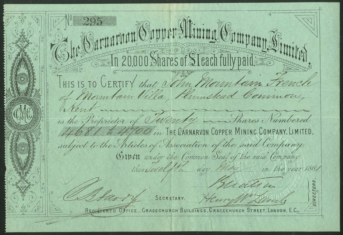 Great Britain: Carnarvon Copper Mining Company Limited, £1 shares, 188[1], #295, scrollwork at left, black on green paper. Mines at Nantlle Vale between Carnarvon and Portmadoc. Ex Spink auction April 2019. VF and rare.
