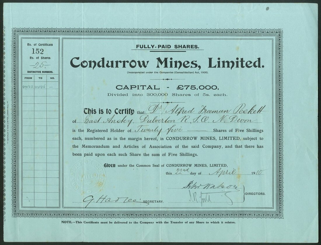Great Britain: Condurrow Mines Limited, 5/- shares, 19[10], #152, black on blue paper, printed by Waterlow & Sons. Registered 17th March 1910 as a reconstruction of Condurrow United Mines Ltd., owning the Great Condurrow and South Dolcoath Tin and Copper Mines at Camborne, Cornwall. VF and scarce.