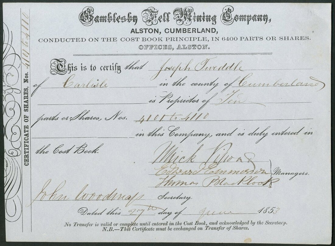 Great Britain: Gamblesby Fell Mining Company, Alston, Cumberland, [10] shares, 185[3], #4101-4110, small format piece, black on grey paper. A cost book mine with 6400 shares. EF and scarce.
