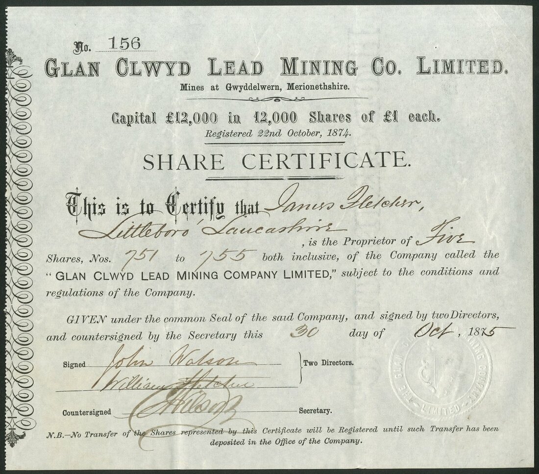 Great Britain: Glan Clwyd Lead Mining Co. Ltd., £1 shares, 187[5], #156, black. Mines at Gwyddelwern, Merionethshire. EF and rare.