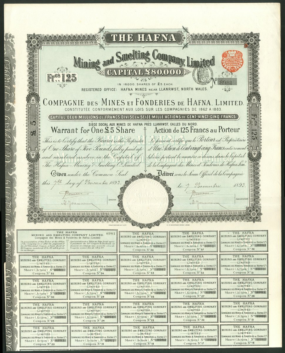 Great Britain: Hafna Mining and Smelting Company Ltd., bearer warrant for 1 share of £5/125 francs, 189[3], #8981, large format, ornate border, green and black, with coupons, text in English and French. Anglo-French company owning mines at Llanrwst, North Wales. EF.
