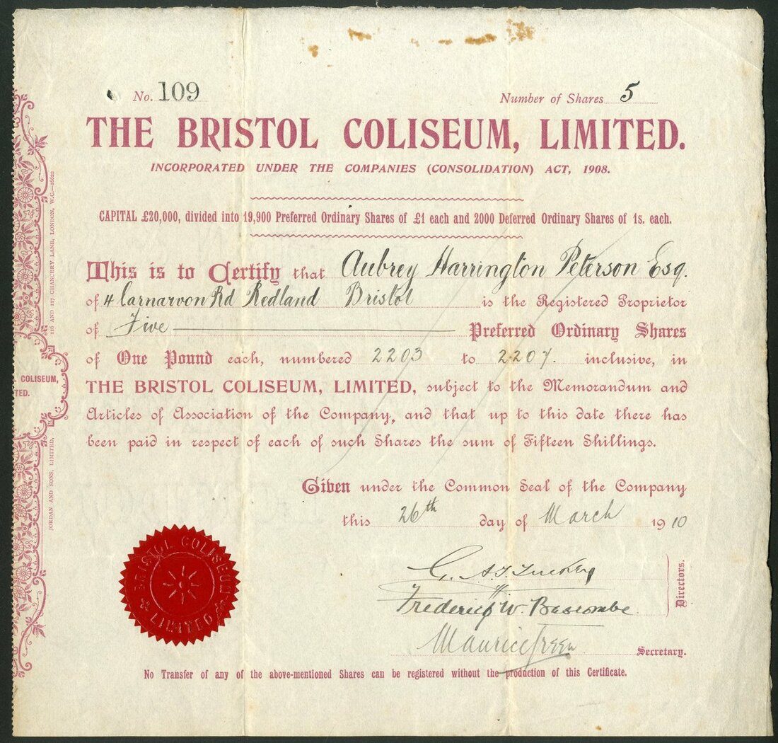 Great Britain: Bristol Coliseum Limited, £1 preferred ordinary shares, 19[10], #109, mauve, red seal. Built as a cinema and roller skating rink in 1910. Utilised during WWI as an aircraft factory and interestingly the Bristol Coliseum Volunteers was a unit raised during the war. Between WWI and WWII it was host to several exhibitions. Used as an ice skating rink and home to the Bristol Bears (later Bristol Bombers) hockey team. Destroyed by German bombers in 1940. F-VF and rare.