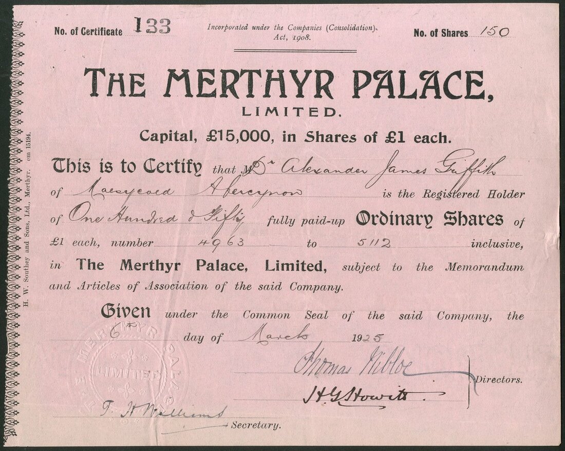 Great Britain: Merthyr Palace Limited, £1 shares, 19[25], #133, black on pink paper. The Merthyr Palace Ltd. opened as a cinema on Pontmorlais Circus, Merthyr Tydfil in 1911. For some years it was successful, paying dividends of between 15% and 35%. However it was re-registered as a company of the same name in 1919. VF.