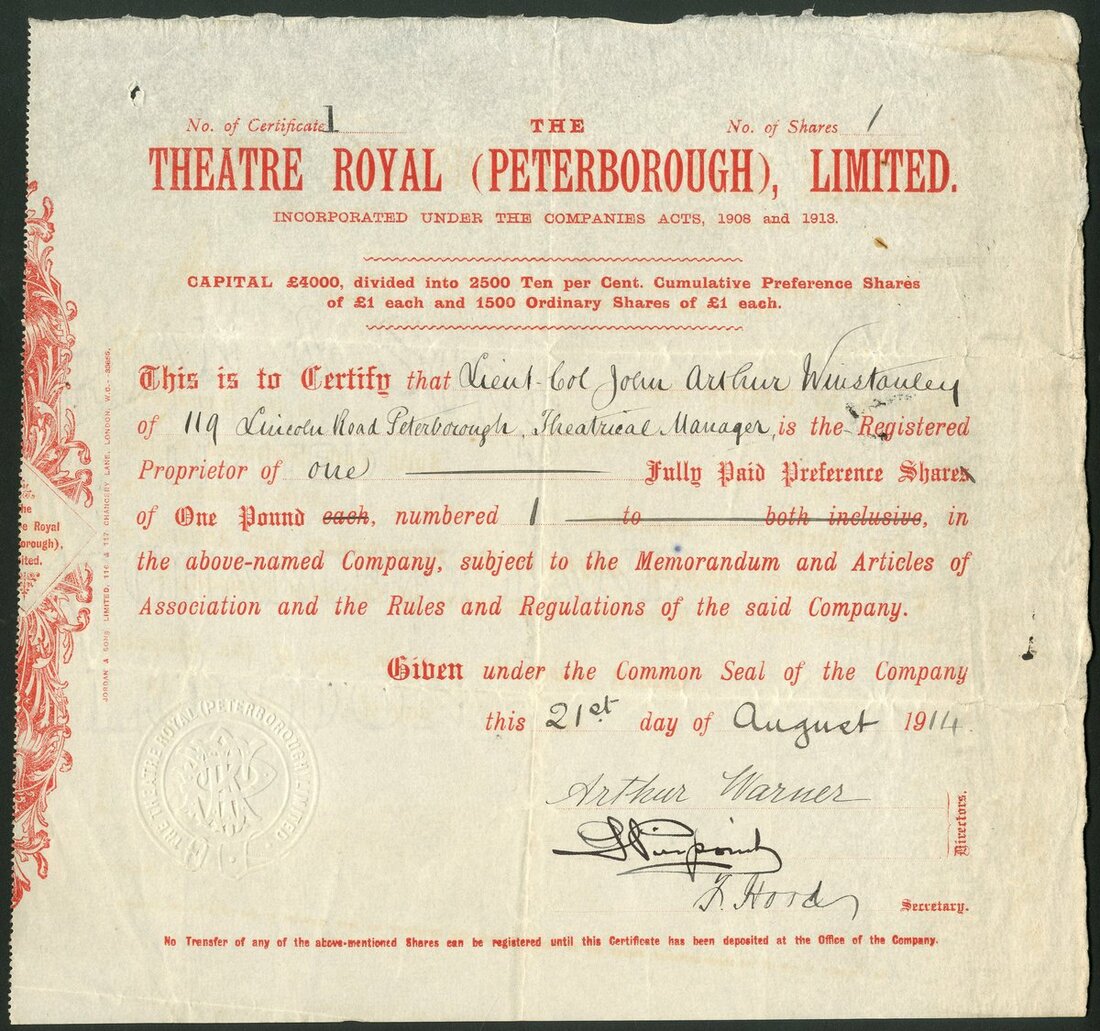 Great Britain: Theatre Royal (Peterborough) Limited, £1 preference shares, 19[14], #1, scrollwork at left, red. The theater was created in 1890's when it acquired the old Fitzwilliam Hall. Passed through several ownerships until closed in 1959. Demolished and Shelton's Department Store built on the site. AVF and scarce.