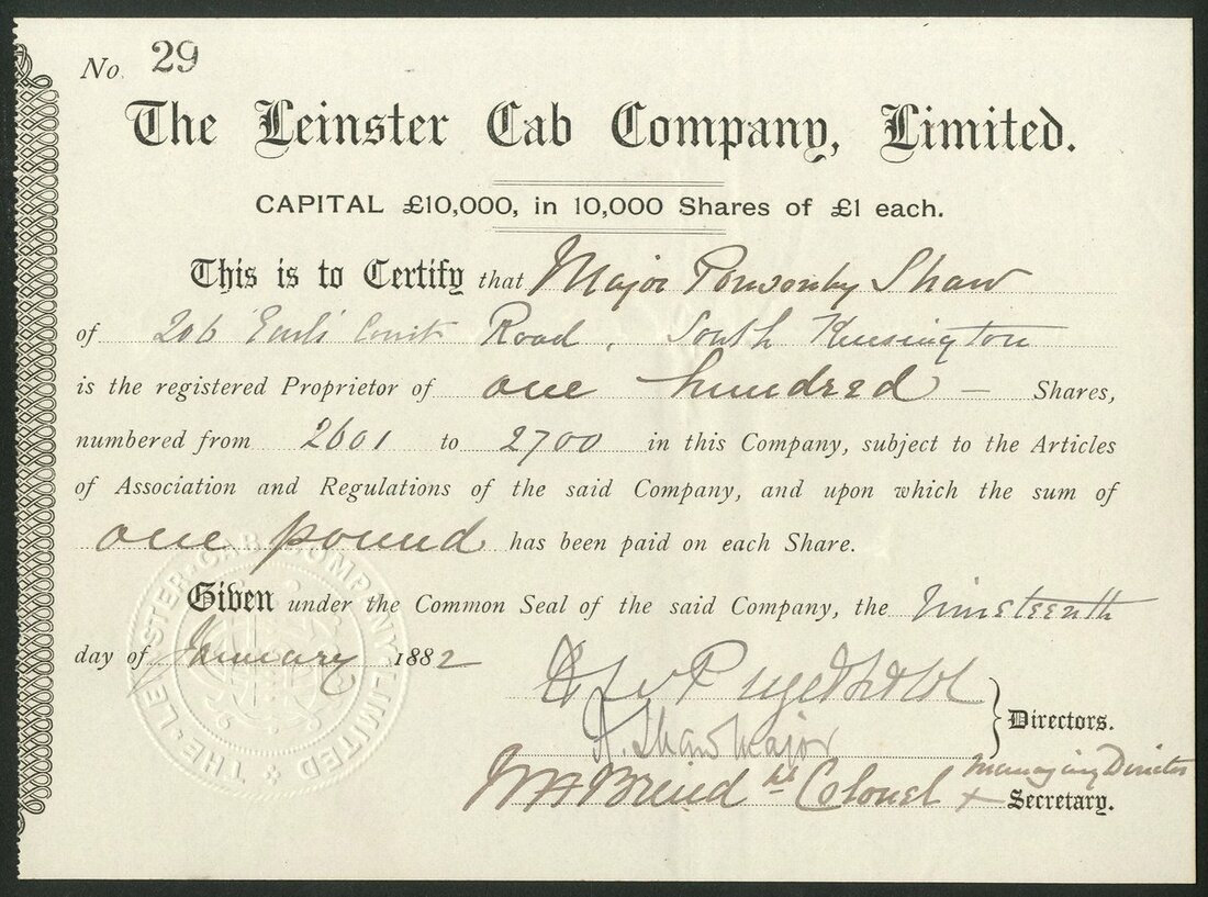 Ireland: Leinster Cab Company Limited, £1 shares, 188[2], #29, black. Registered in November 1881 to operate Forder horse-drawn cabs from Leinster-yard, Westminster, London. In liquidation by 1883 and their 37 cabs and 60 horses put up for auction. EF and scarce. Note: in this section in error as it was catalogued before adequate research!