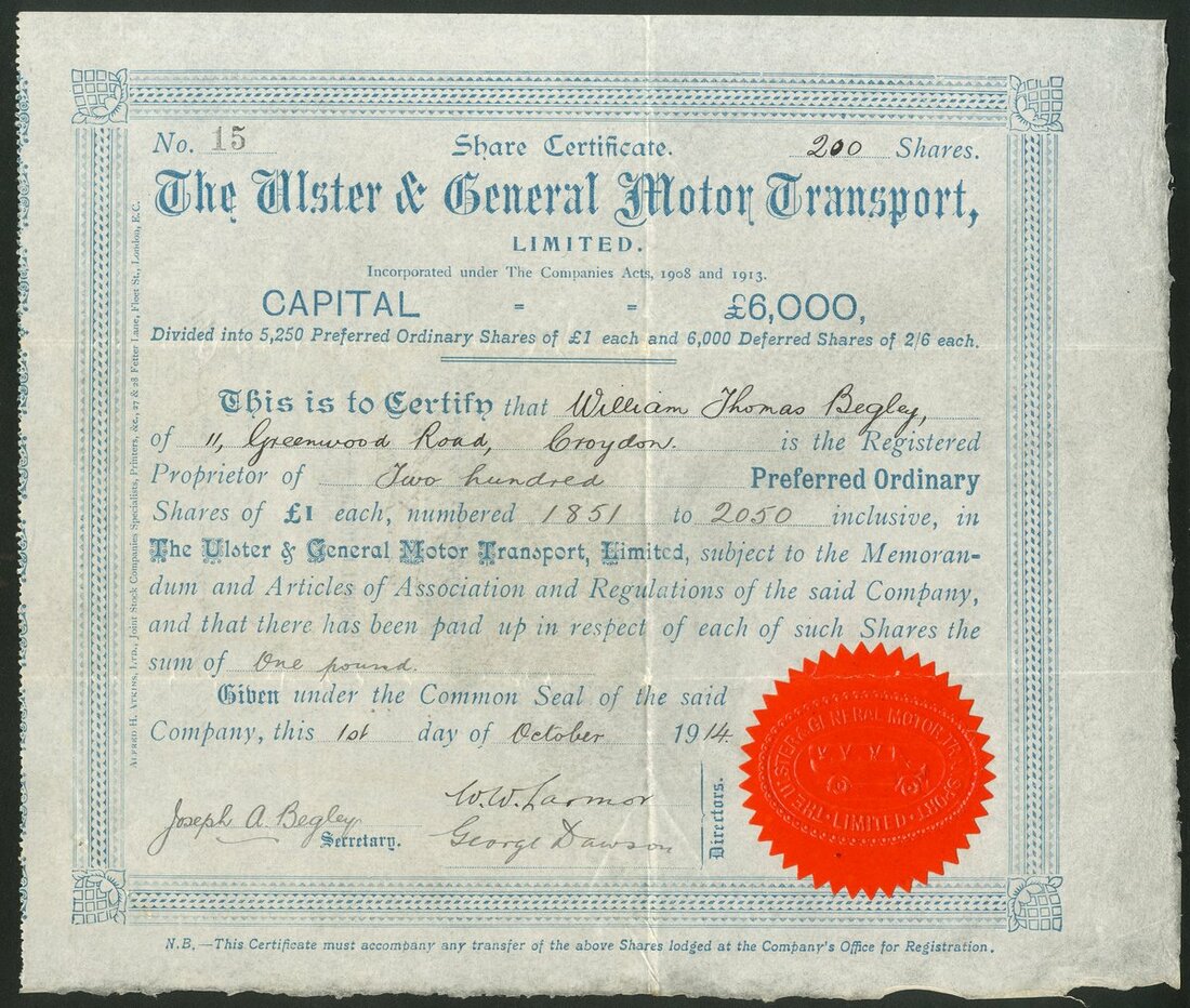 Ireland: Ulster & General Motor Transport Limited, £1 Preferred Ordinary shares, 19[14], #15, ornate border, blue, lovely red seal depicting a motor omnibus. GVF.