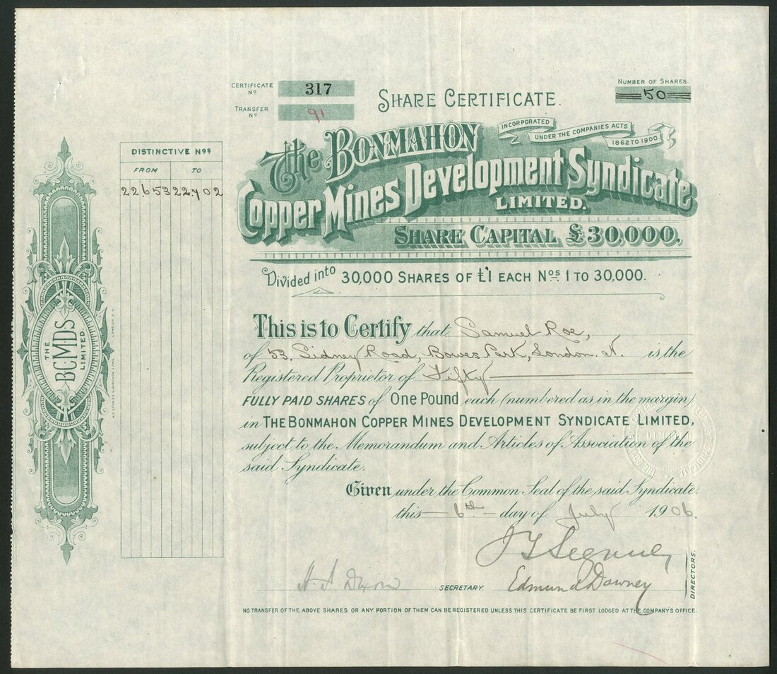 Ireland: Bonmahon Copper Mines Development Syndicate Ltd., £1 shares, fully paid, 19[06], #317, scrollwork at left, green. Mines on the Waterford coast. VF and rare. A similar example sold at £60 in 2010.