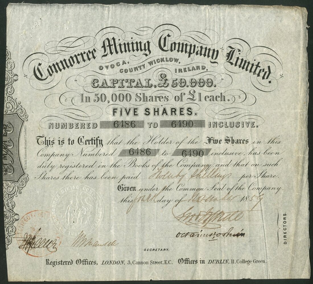 Ireland: Connorree Mining Company Limited, 5 shares of £1, 18[59], #6486-6490, scrollwork at left, black. Copper and sulphur mines at Ovoca, County Wicklow. VF.