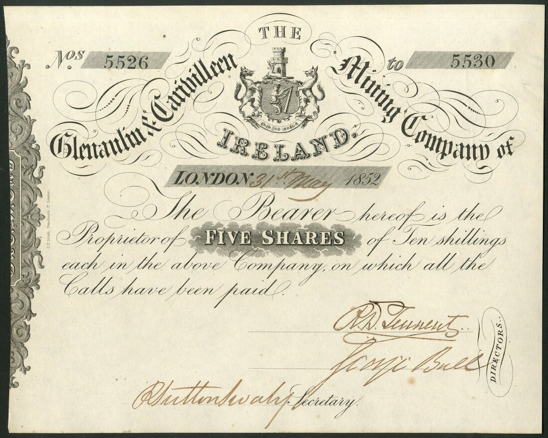 Ireland: Glenaulin & Carivilleen Mining Company of Ireland, 5 shares of 10/-, London 1852, #5530, coat of arms within title, black. EF.