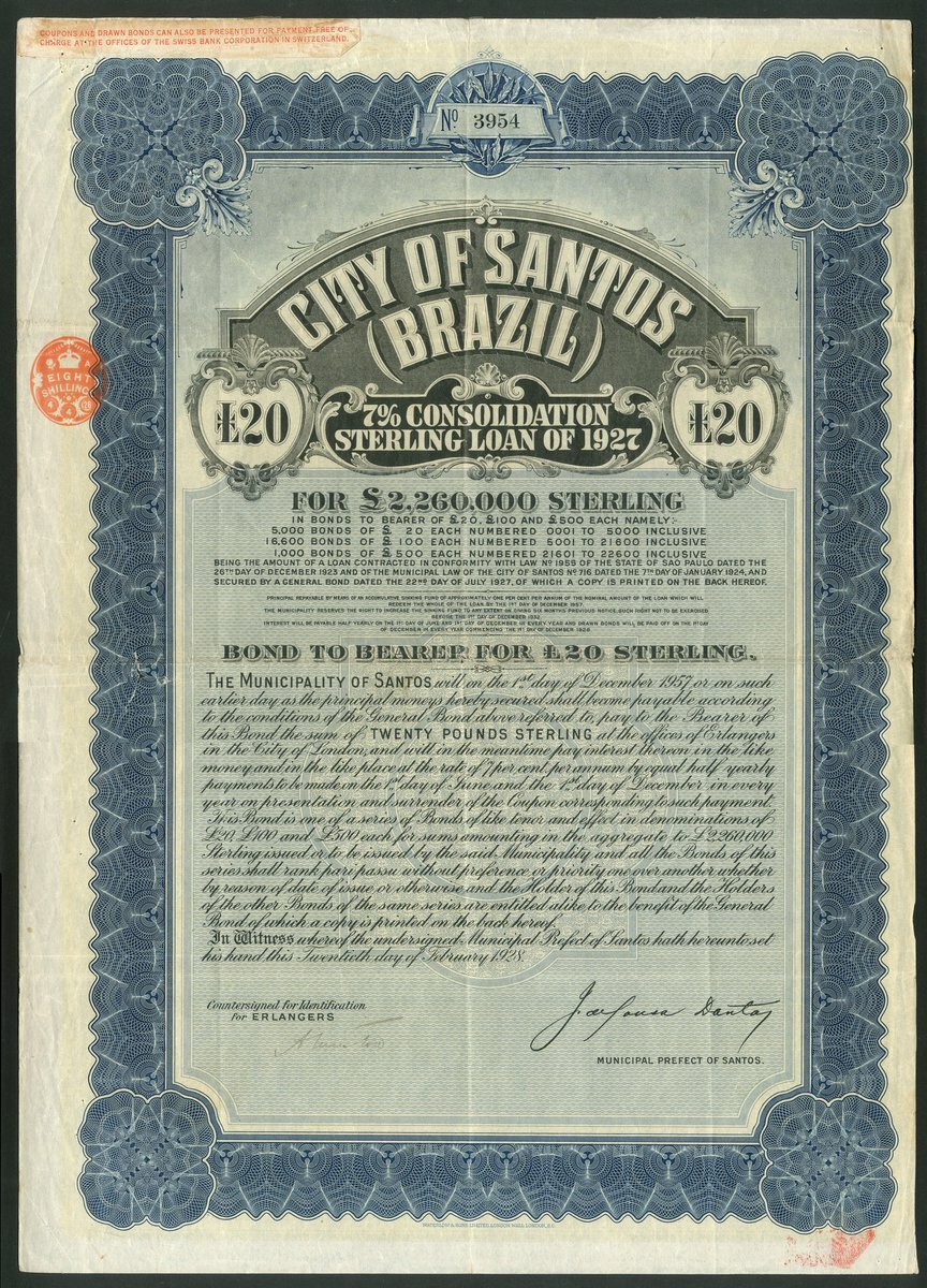 Brazil: City of Santos 7% Consolidation Sterling Loan of 1927, bond for £20, #3954, ornate border, blue and black, printed by Waterlow & Sons, no coupons remain. Small ear at top edge, small split in centre, F-VF and rare.
