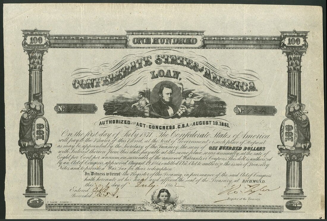 Confederate States: Act of 19th August 1861, a group of 3 bonds comprising $100, redeemable 1st July 1869, $100, redeemable 1st July 1871 and $1000, redeemable 1st July 1881 (Ball, 54, 67 and 135), all with coupons. F-VF (3).