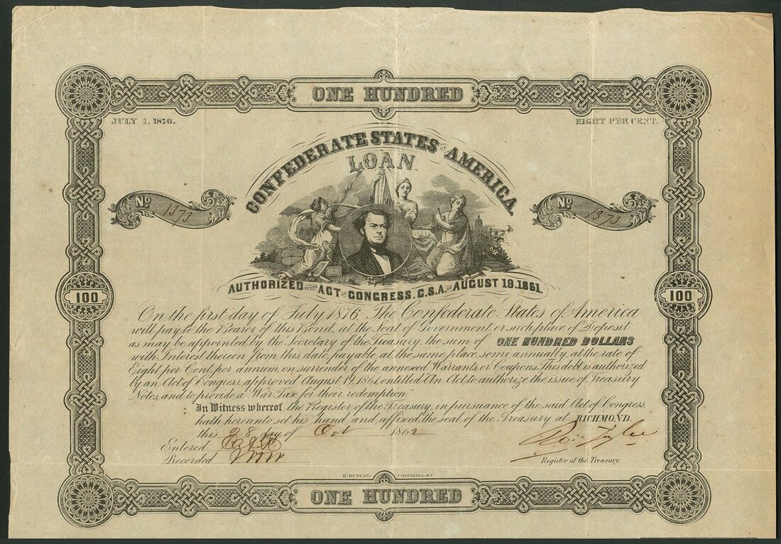 Confederate States: Act of 19th August 1861, $100, redeemable 1st July 1876, #1373, Mallory surrounded by allegorical figures, with handwritten endorsement reissued by James Sorley, Depositary in January 1863 (Ball 97), with coupons. VF and scarce.