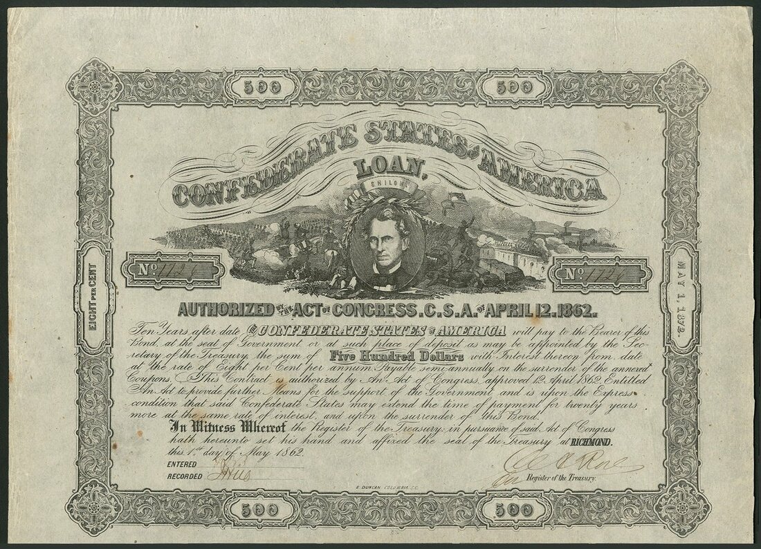 Confederate States: Act of April 12 1862, 8% Loan, redeemable 1872, $500, #1726, Battle of Shiloh with Memminger in centre, with coupons (Ball 148). VF.